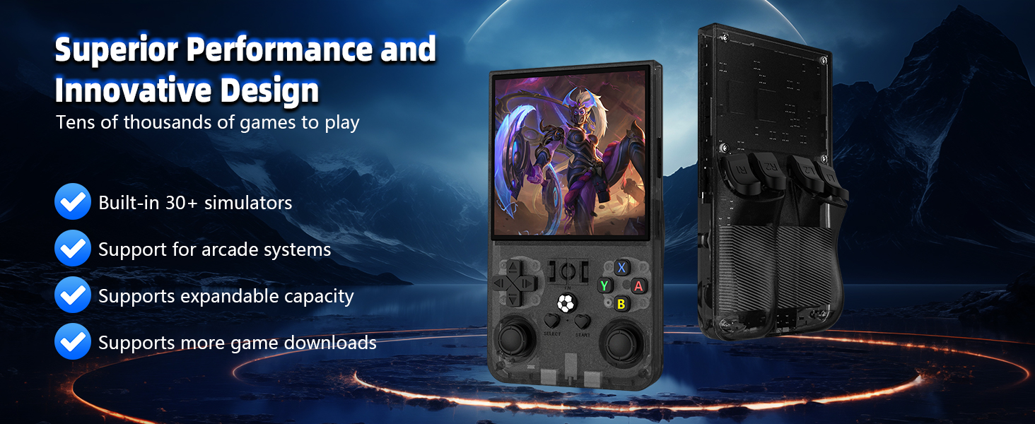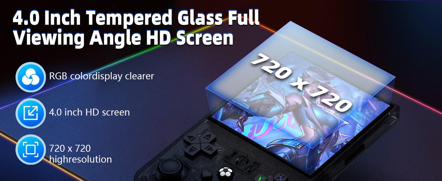 【4.0 inch HD Tempered Glass Screen】The R36MAX Retro features a 4.0 inch IPS screen covered with scratch-resistant tempered glass. The screen has a resolution of 720*720 pixels, presenting clear images and soft colors. Therefore, whether it's the delicate details of the game graphics or the light and shadow special effects in the intense battles, they can all be accurately displayed, effectively reducing visual fatigue and allowing players to immerse themselves in the game.